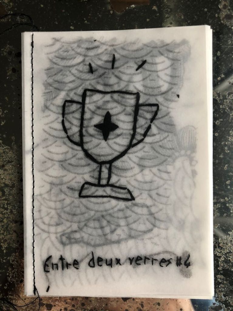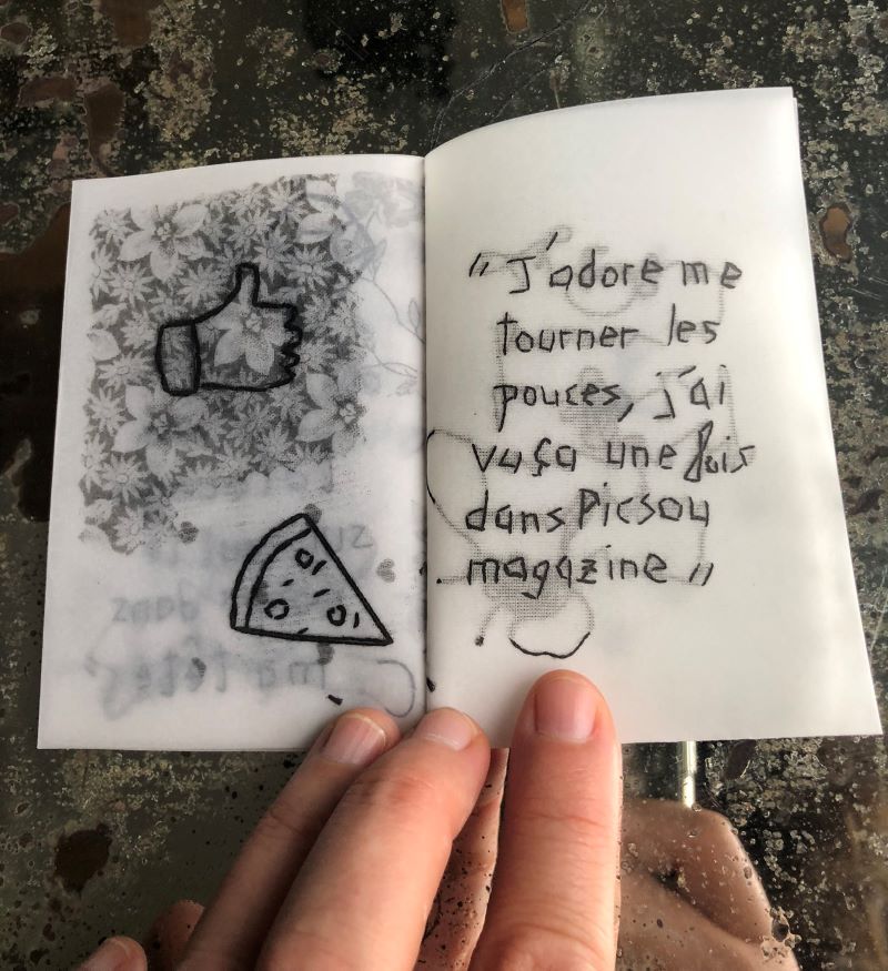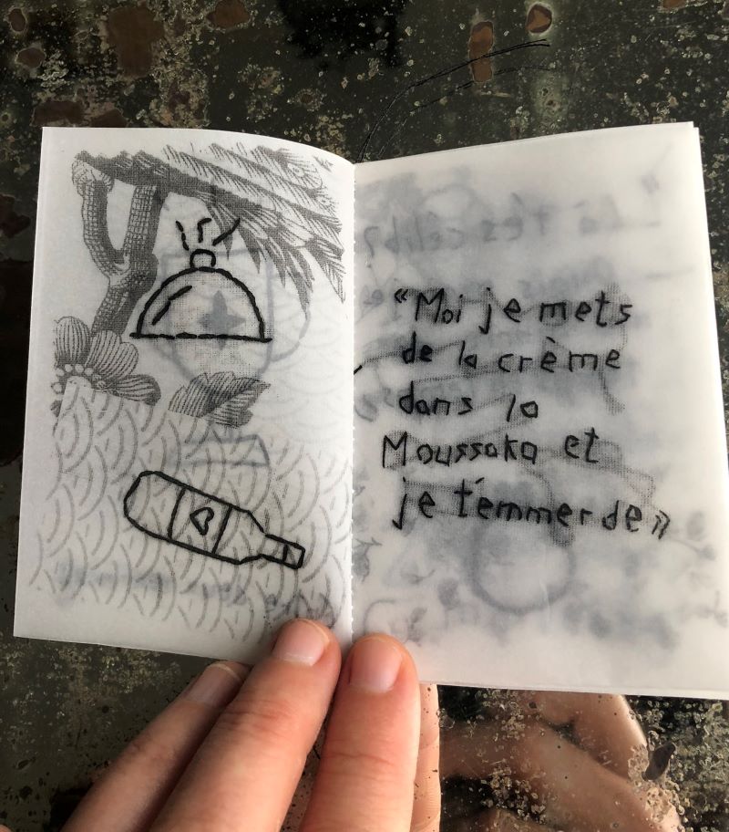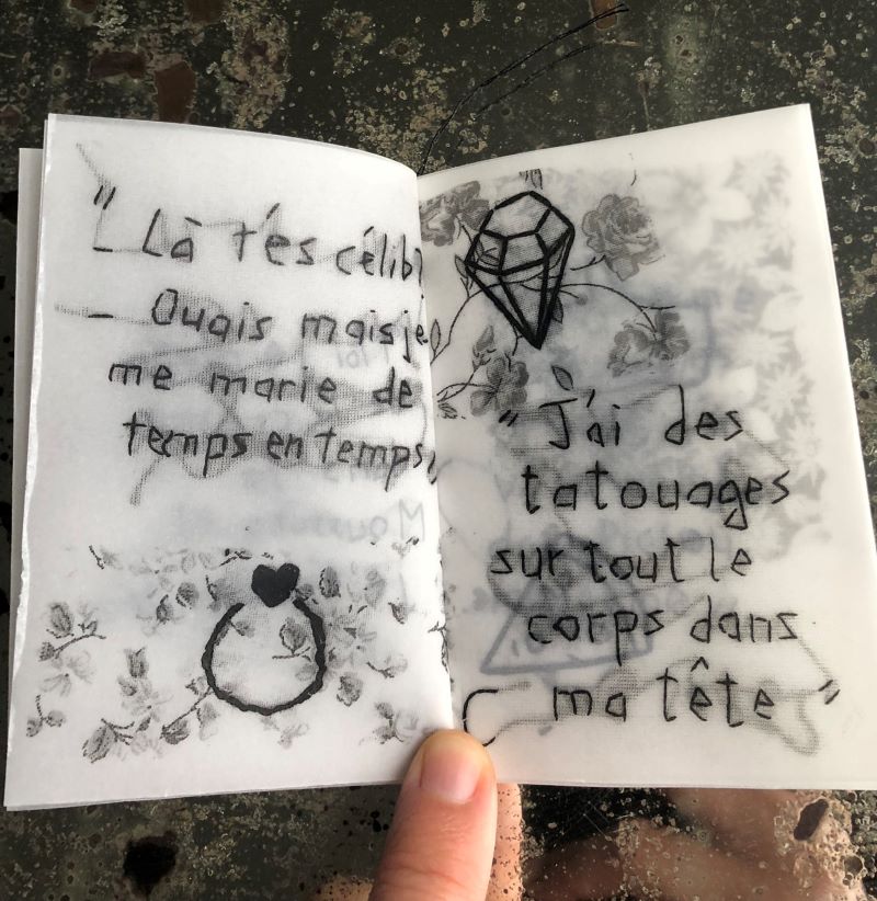 Recueil de citations de soirées (arrosées), notées (en biais), brodées (mal), sur du tissu (à fleurs), photocopiées (en noir et blanc) sur du papier (calque)