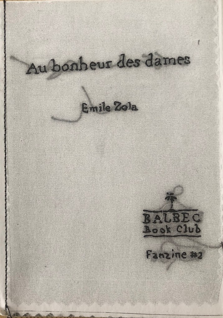Premier né de mes séries de fanzines, le Balbec Book CLub est un fanzine littéraire, un peu dans la lignée du podcast. L’idée est de partager la littérature en la rendant matérielle, tangible, et si possible un peu marrante. J’ai décidé de le faire à partir de broderie et de tissu, parce que le tissu photocopié c’est beau, mais pas trop propre, parce que je trouve ça encore plus beau.